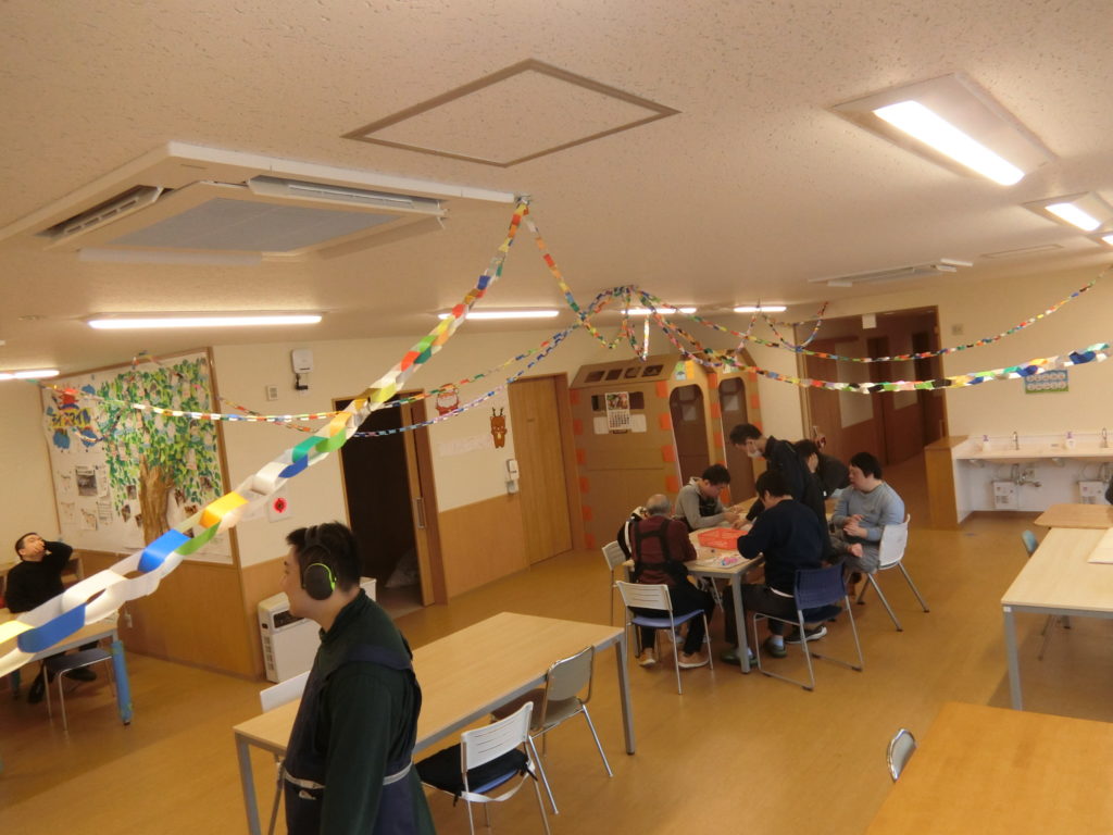 皆さん、一つずつ心を込めて輪をつなぎました。みんなの頑張りでフロアの天井に