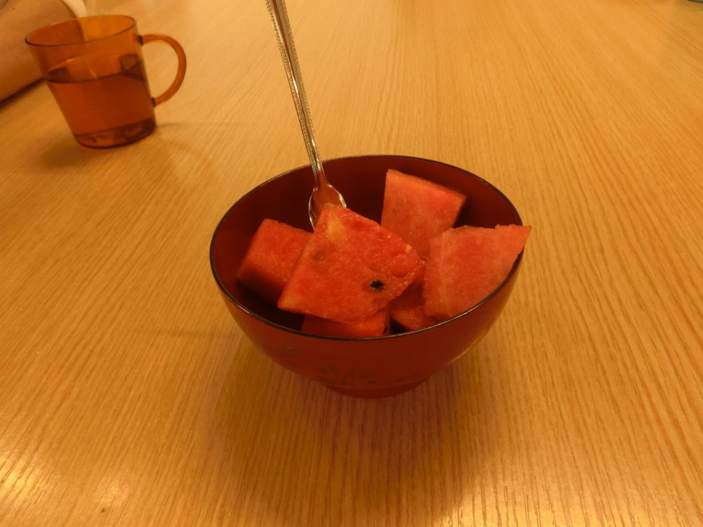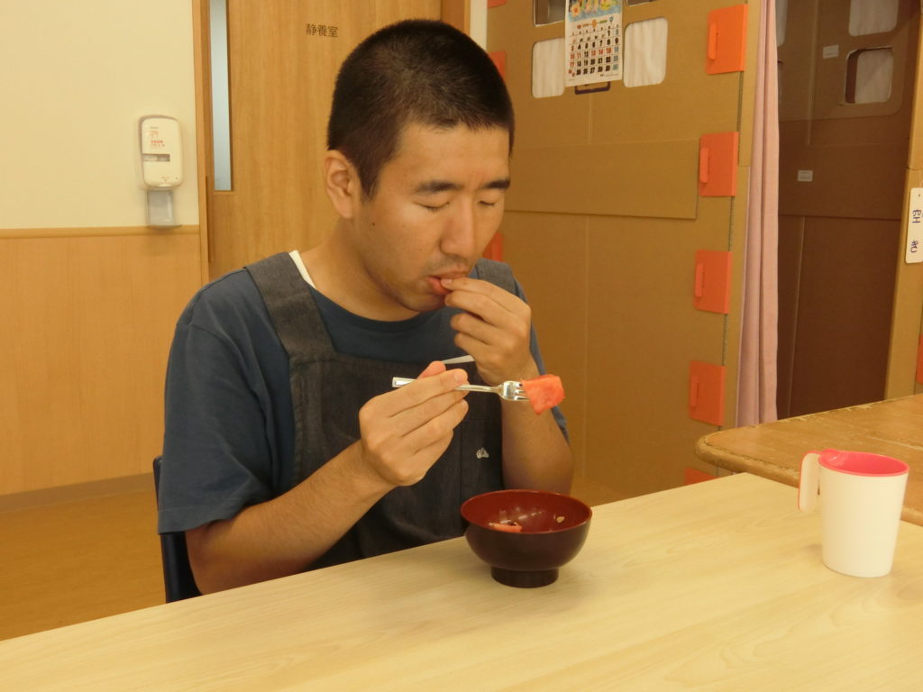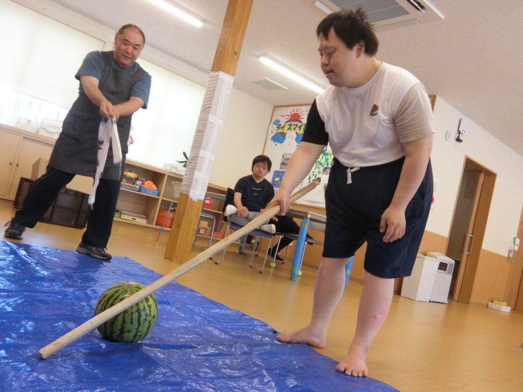 連日の猛暑が続く中、「利用者のみなさんでスイカ割りを楽しんでください。」と、