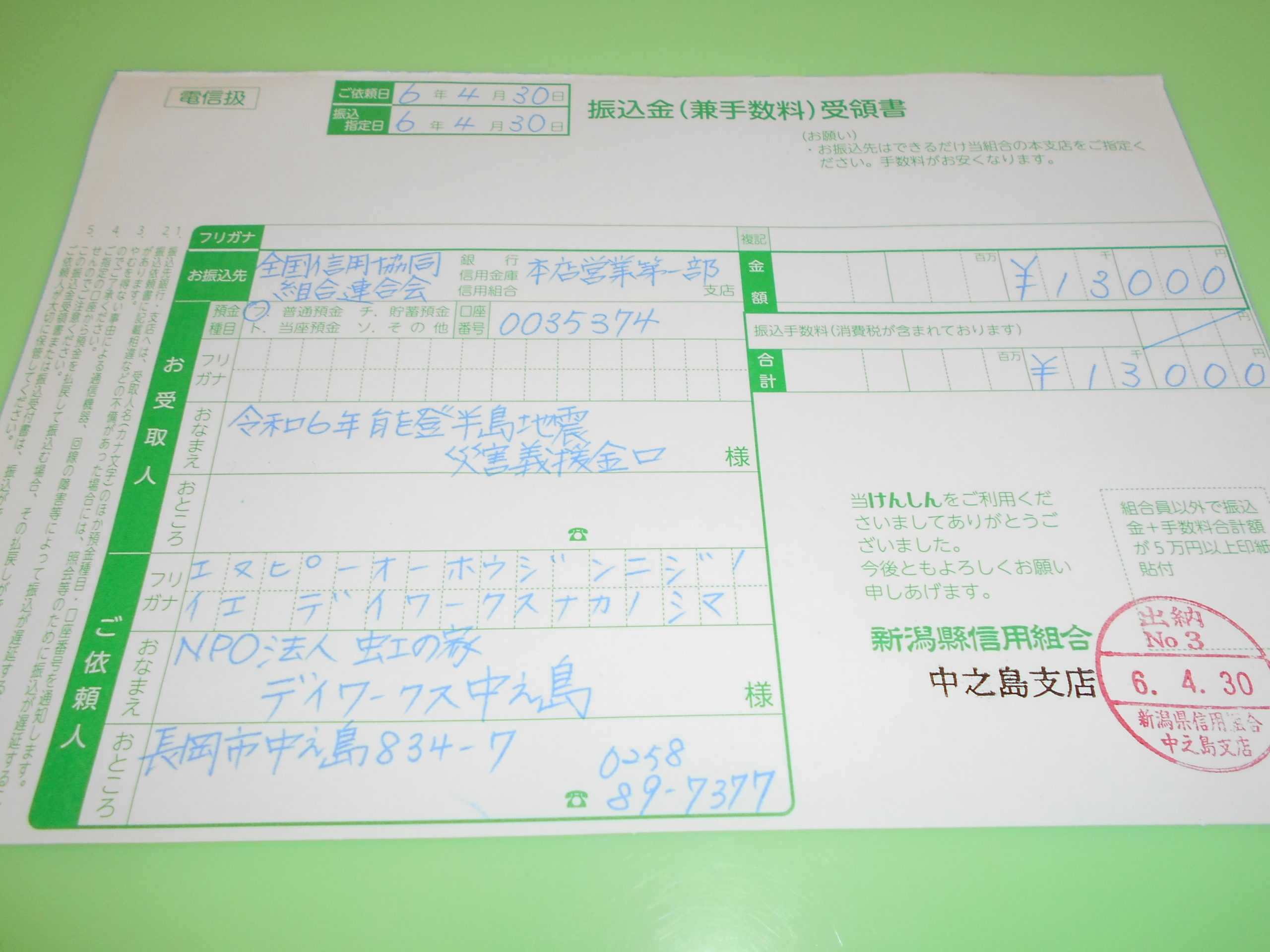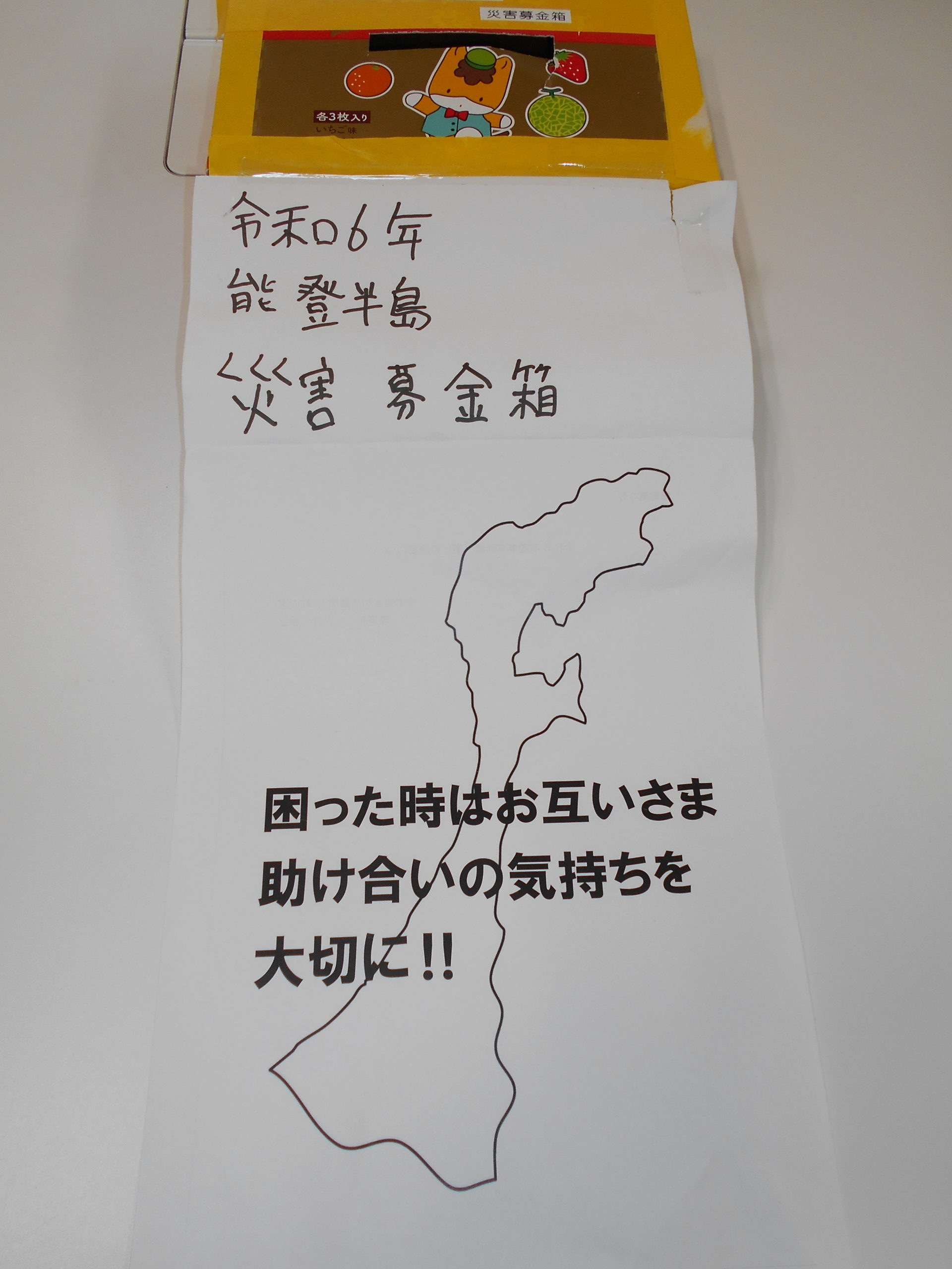 私たちも「中越地震」「中越沖地震」の際には全国の皆さんから温かい支援を頂いたので、今度は恩返しの気持ちで「困ったときはお互いさま」を合言葉にデイワークス中之島の玄関に募金箱を置いて利用者はじめ職員のみんなで義援金を呼びかけました。災害はいつどこで起きても不思議ではありません。4月30日に合計13,000円の温かい思いやりの心をお届けしました。