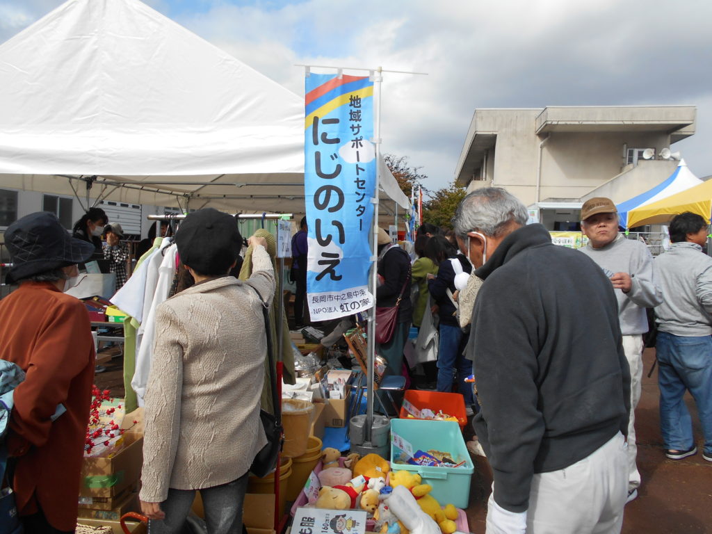 今年の産業まつりは、10月の第3日曜日の10月20日(日)でした。次第にコロナ禍が薄れて来たうえに、寒いながらも何とか好天に恵まれてものすごい人出でした。「虹の家」でも品揃えの商品を3つに絞って「フリマ」「綿あめ」「ひもくじ」として出店しました。