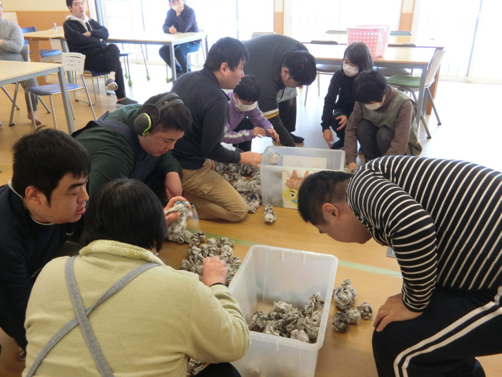 各チームに分かれて、散らばった豆(新聞玉)をたくさん集めました♪