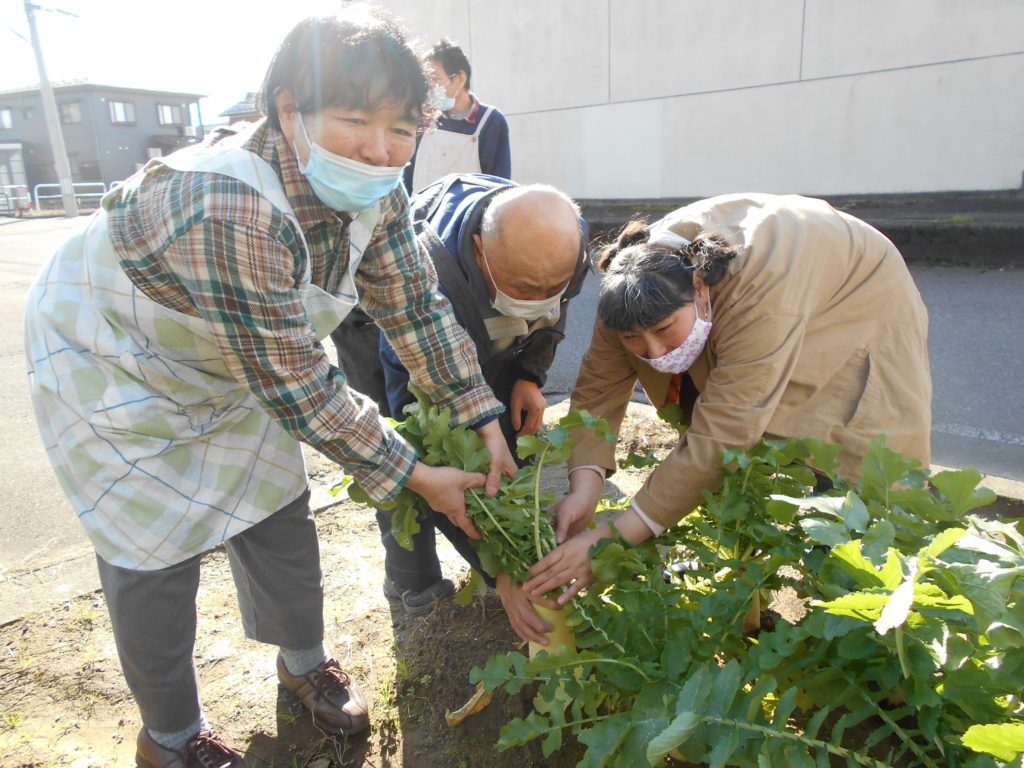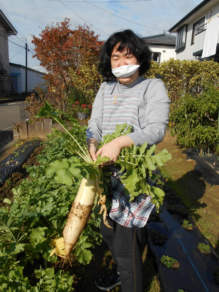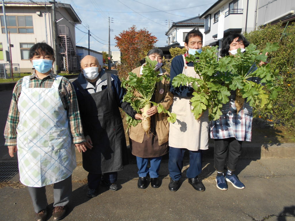 中之島7番組の本部の脇にあるデイワークス中之島の畑では、冬野菜の大根が順調に育っています。そのうち、わずかですが11月13日には3本収穫することが出来て、16日のデイライフ中条の誕生会の食材の一部に役立てていただきました。